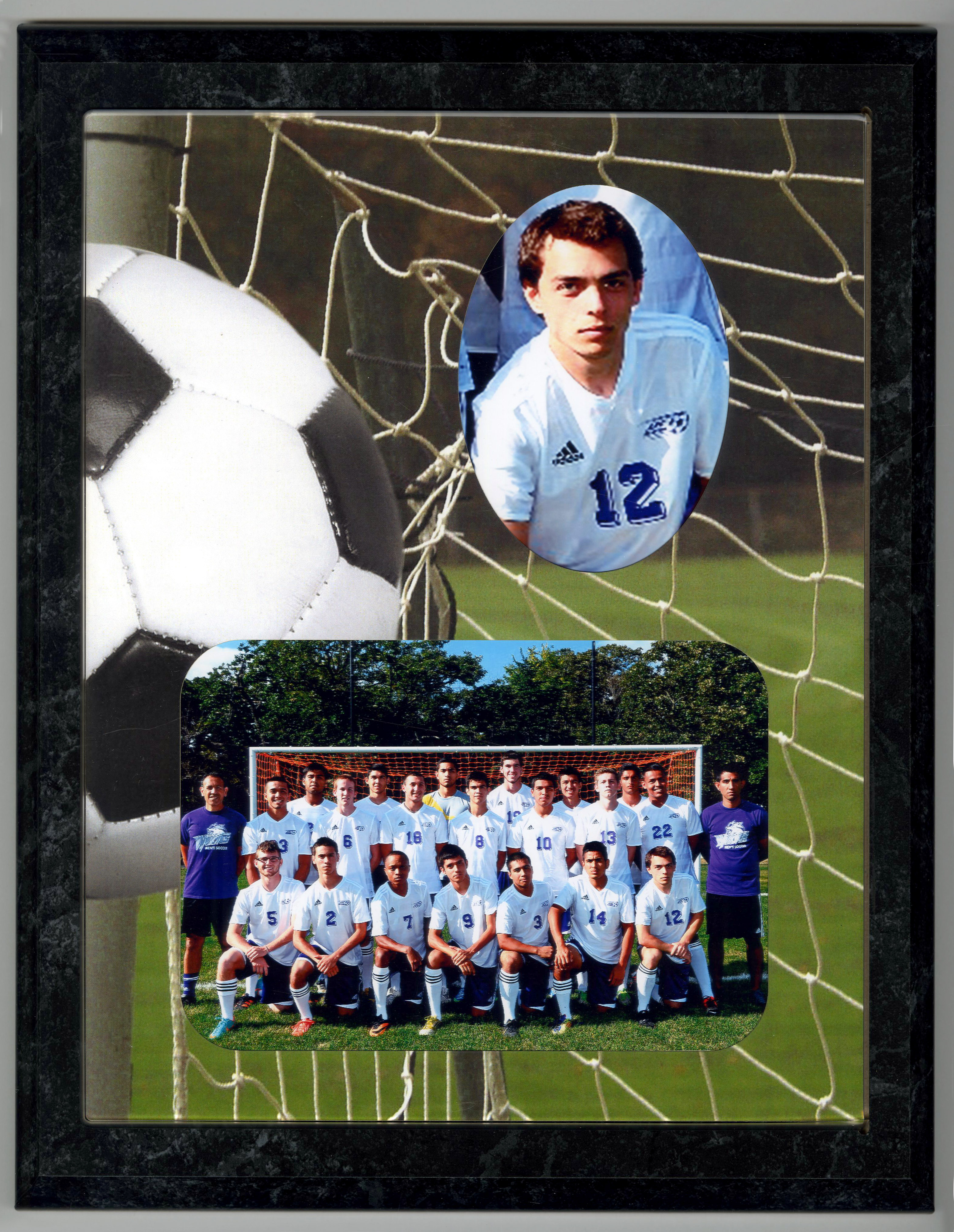 The Econ-Sports Charcoal Marble plaque is ordered with various sport mats. The plaque size is 10.5×13. This is a wood plaque with a protective acrylic cover. These are not individually boxed, they are packaged in a foam pouch. The sport mats options are a Football Field, Football, Basketball, Baseball, Soccer, Cheerleading, and Dance.