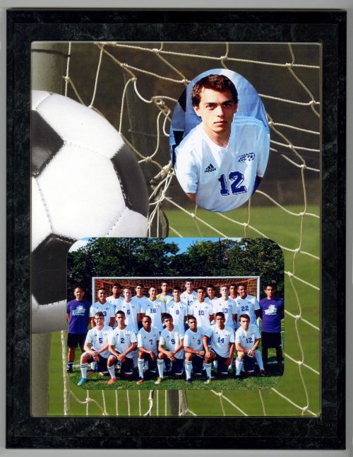 The Sports plaque is ordered with various sport mats. The plaque size is 10.5×13. This is a wood plaque (options are black or walnut) with a protective acrylic cover. These are not individually boxed, they are packaged in a foam pouch. The sport mat options are a Football Field, Football, Basketball, Baseball, Soccer, Cheerleading, and Dance.